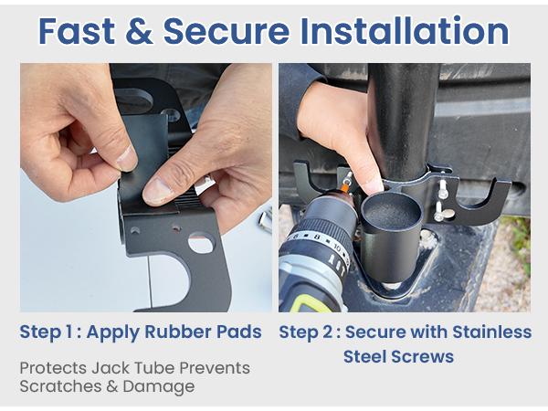 Comes complete with all required stainless steel hardware, anti-scratch rubber pads, and matching tools. No drilling, no welding, no complex modifications needed. Secure it to your trailer jack in 2 simple steps, with zero damage to your valuable rig.